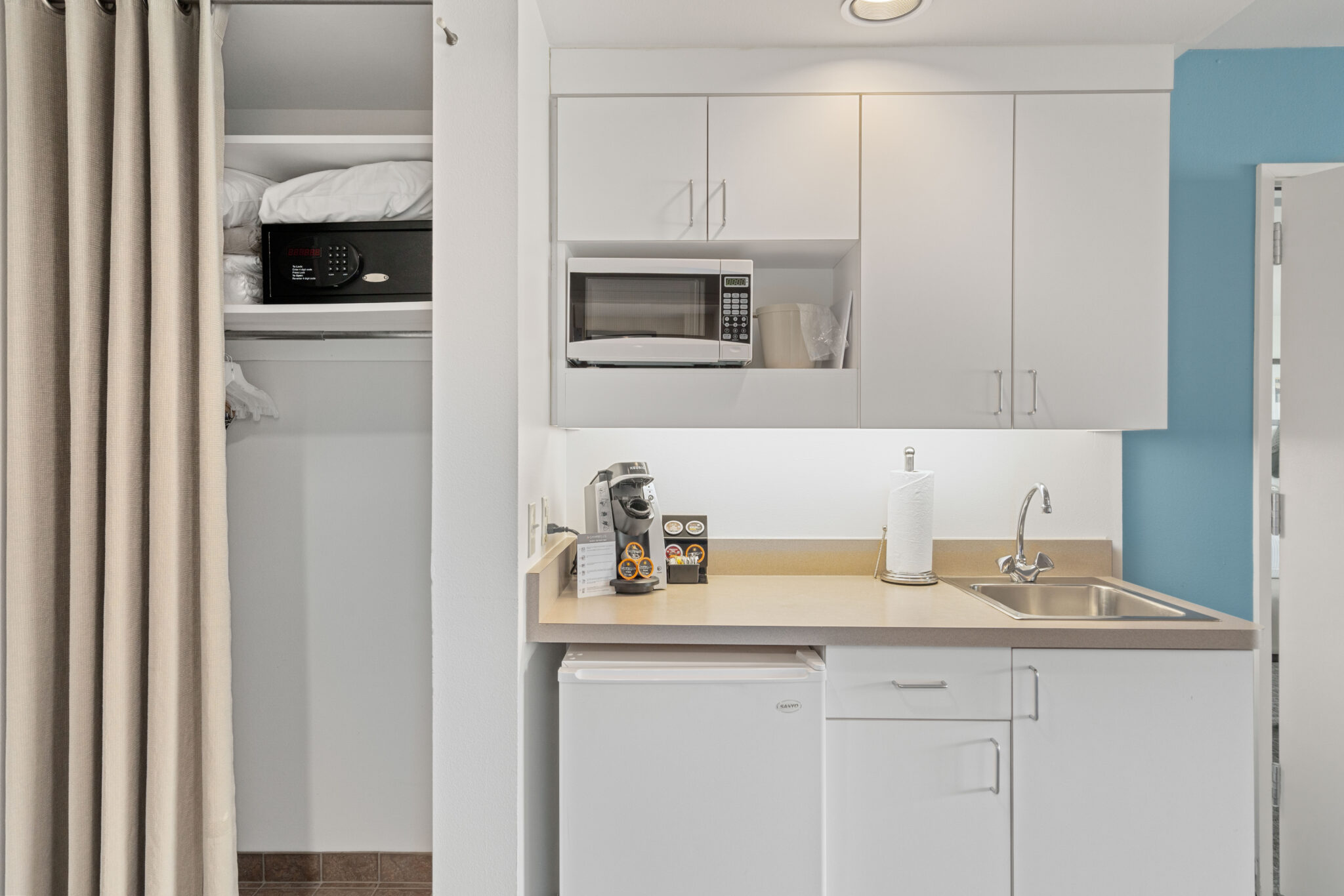 These studio hotel rooms have a pillow-top mattress king bed and are wheelchair accessible, featuring large bathrooms with safety bars and a portable bathtub chair. This room inclu…- Private patio or balcony