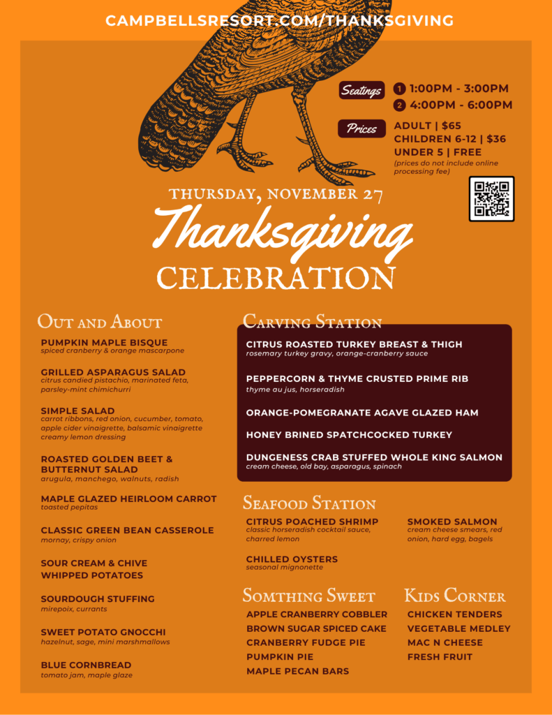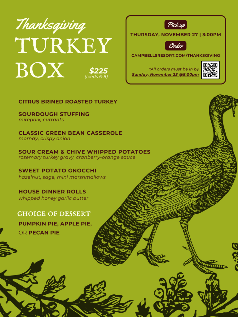 Enjoy the cozy, intimate, historic charm of the Bungalow Café, or gather friends and family in the spacious Centennial Ballroom. With exceptional food, a welcoming atmosphere, and a touch of holiday excitement, Campbell’s Resort is the perfect place to make memories this Thanksgiving.